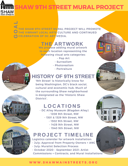 Shaw Main Streets is applying for funding from the DC Commission on the Arts and Humanities' Public Art Building Communities grant program to enhance the DC Alley Museum in Blagden Alley and add new murals to several walls on 9th Street, NW in Shaw.