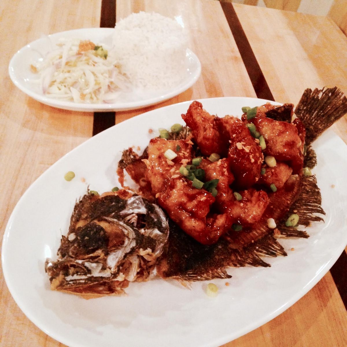 Whole fish, fried and coated with a tamarind sauce, topped with crispy garlic. Served with a Thai slaw.