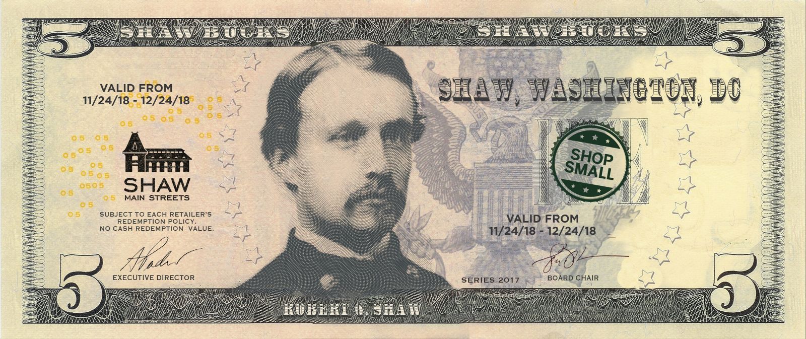 $25,000 worth of $5 "Shawbucks" have been printed on the back cover of the 11/18 amd 12/18 editions of Mid City DC and distributed at retail locations throughout Shaw. Clip and use your “Shawbucks” at participating Shaw Main Streets businesses just like cash! These $5 bills will be deducted from the cost of your purchase. (One Shawbuck per establishment. Minimum purchase required. Valid 11/24/18-12/24/18. Ask each participating retailer for details.)